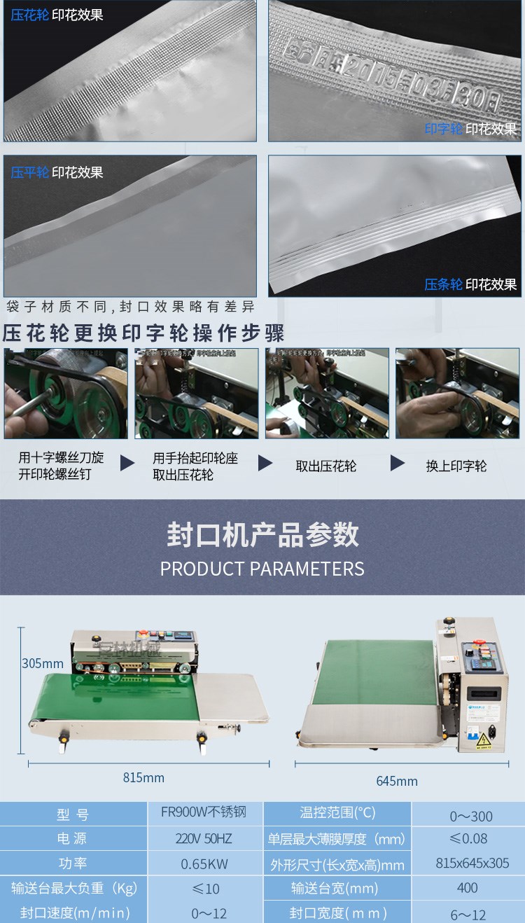 FR-900W全自動(dòng)封口機(jī),可以輸送臺(tái)加寬至400mm,承重加至10kg適用大米袋等較大較重產(chǎn)品封口。