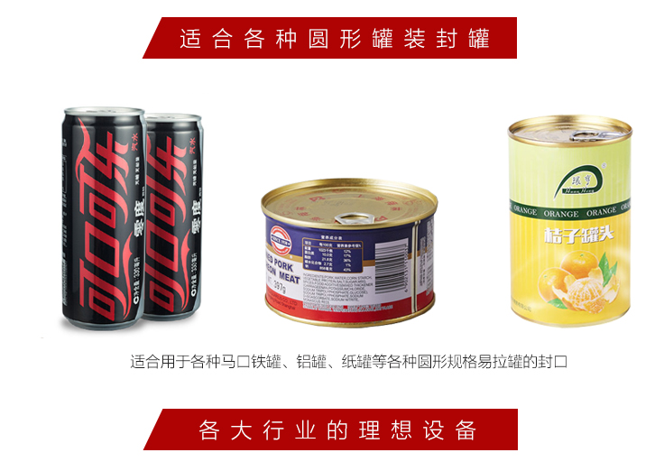 4、適用于各種馬口鐵罐、鋁合金罐、紙罐等各種圓形規格易拉罐的封口,操作簡單易學,是食品、飲料、制藥等行業的理想設備
